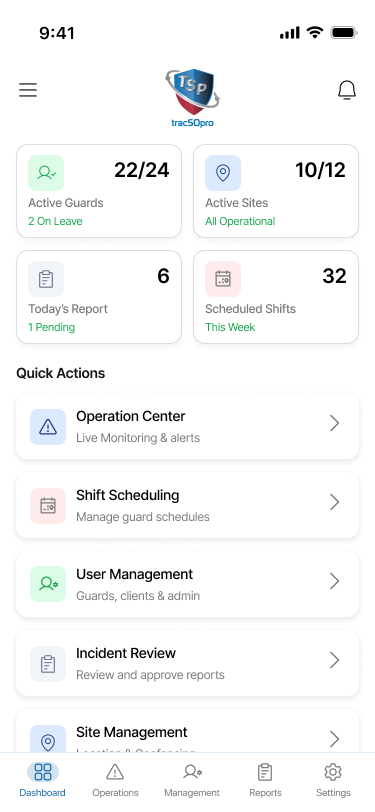 Guards, supervisors, and administrators access the platform through secure authentication methods. Role-based permissions ensure every user only sees what they are authorized to manage, reducing risk and improving accountability.